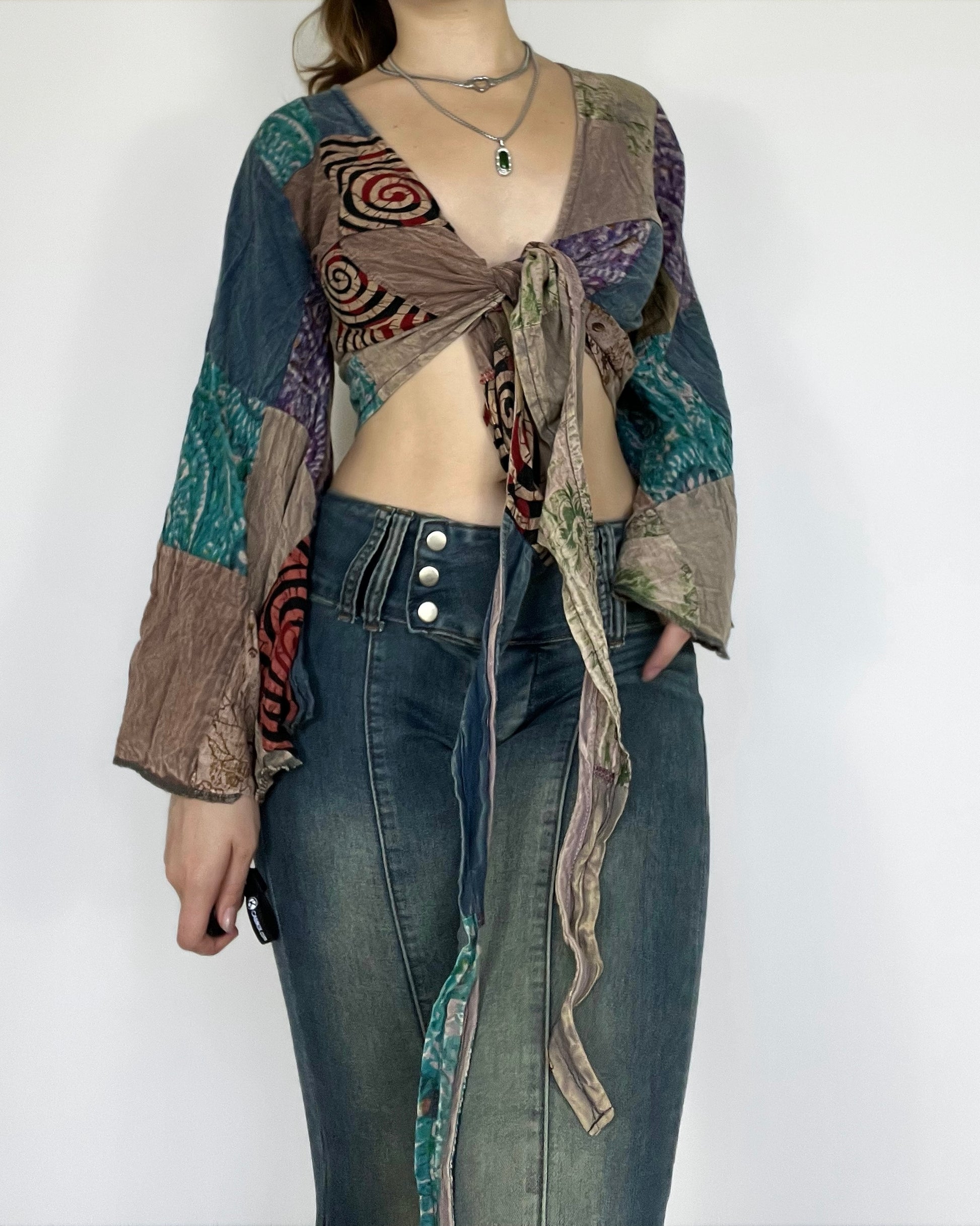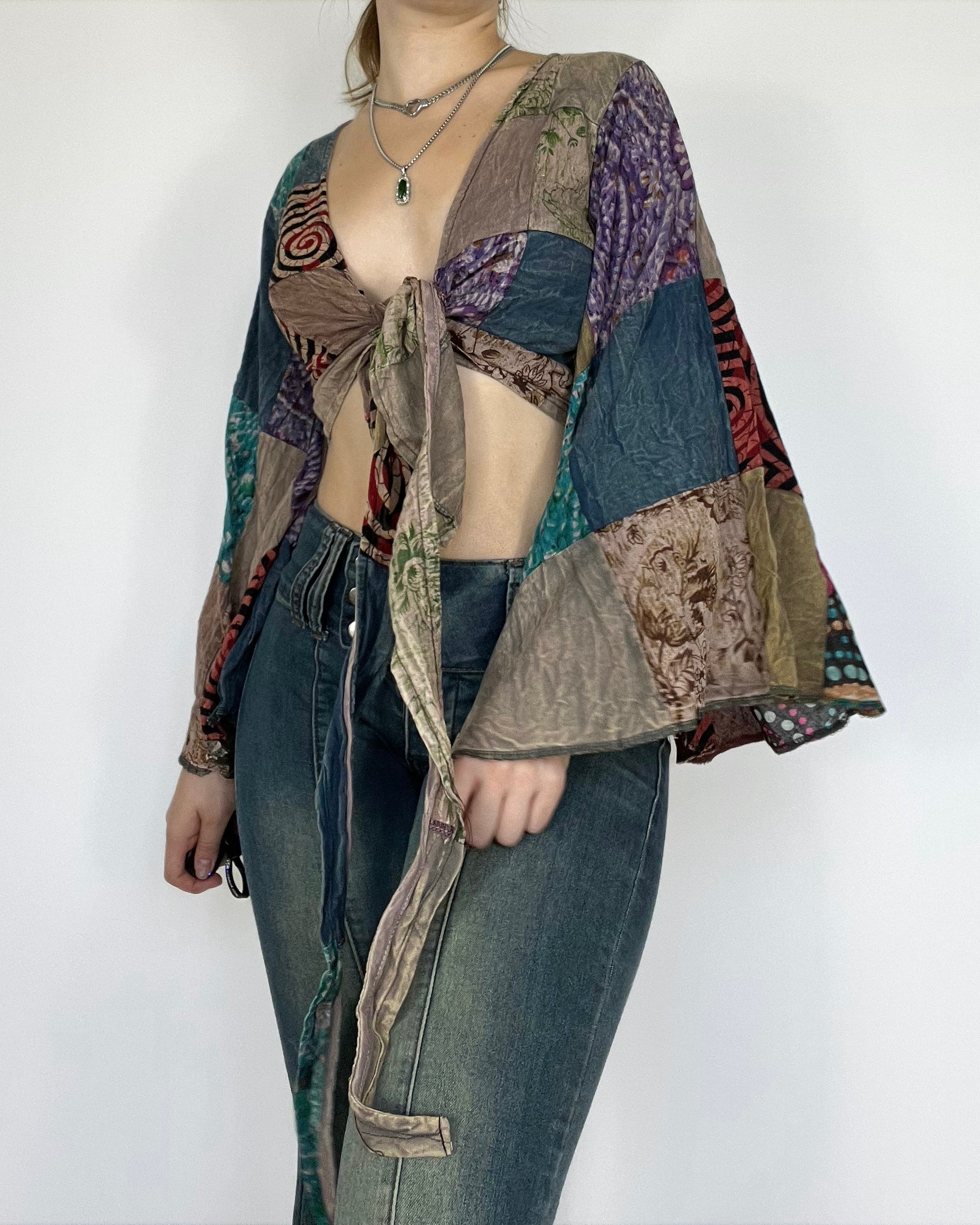 This versatile bell sleeve top features a unique patchwork design and can be tied in two different ways. No two are alike!