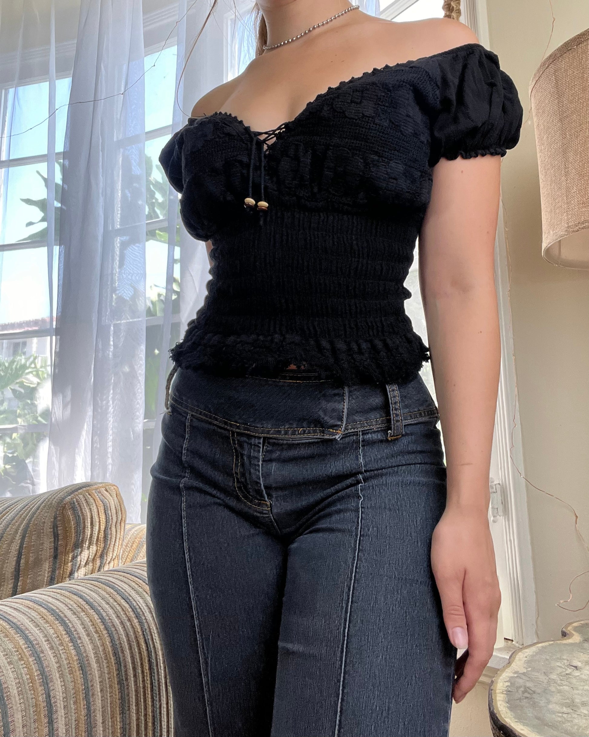 This unique piece features a lace-up V-neck and intricate detailing along the bottom.